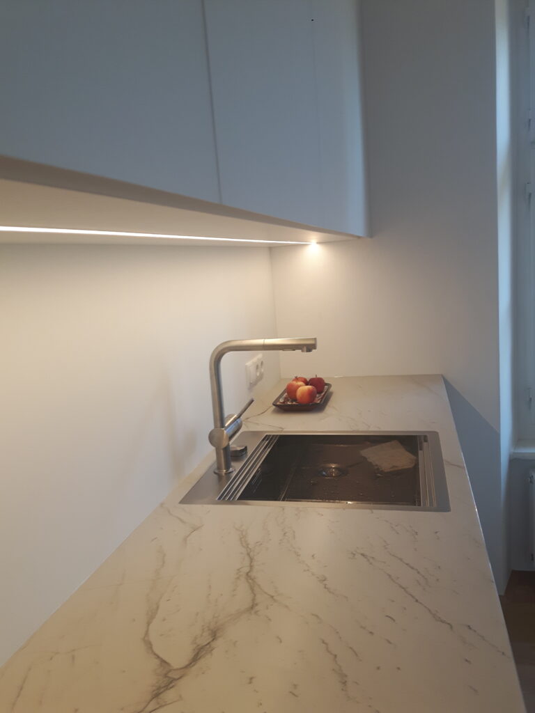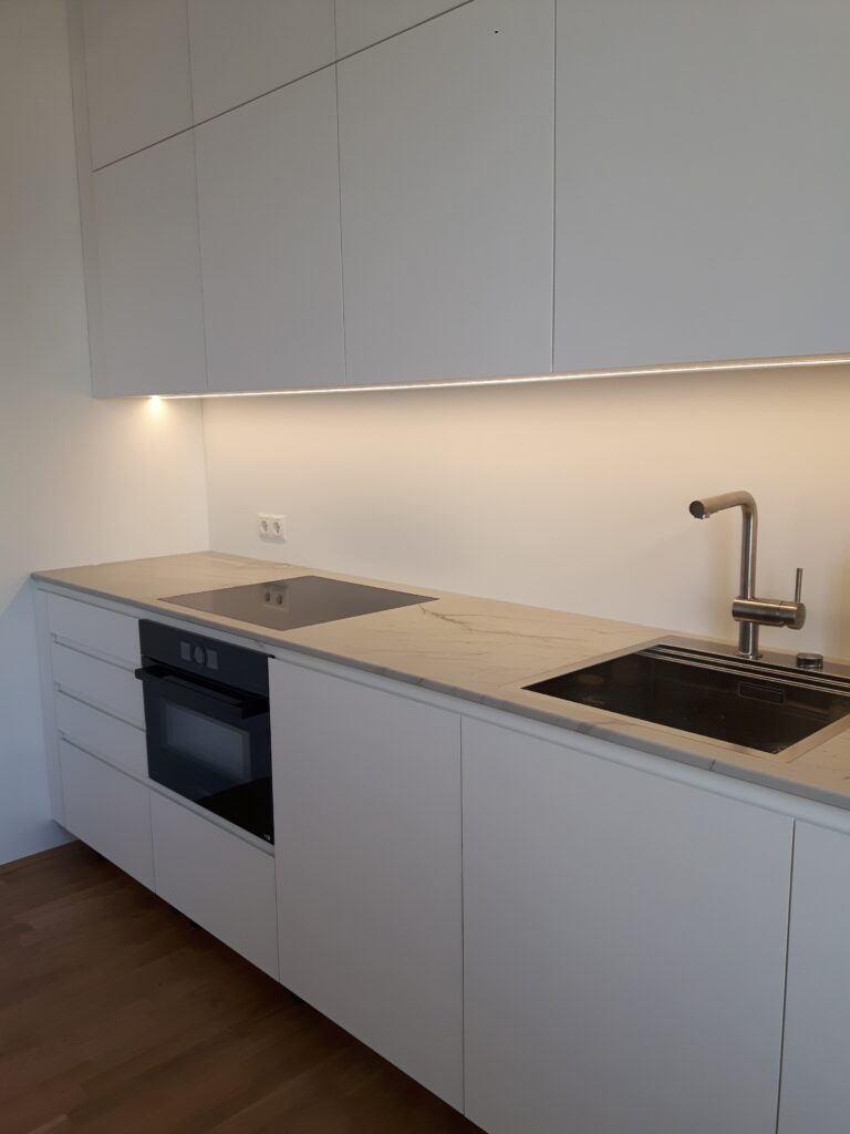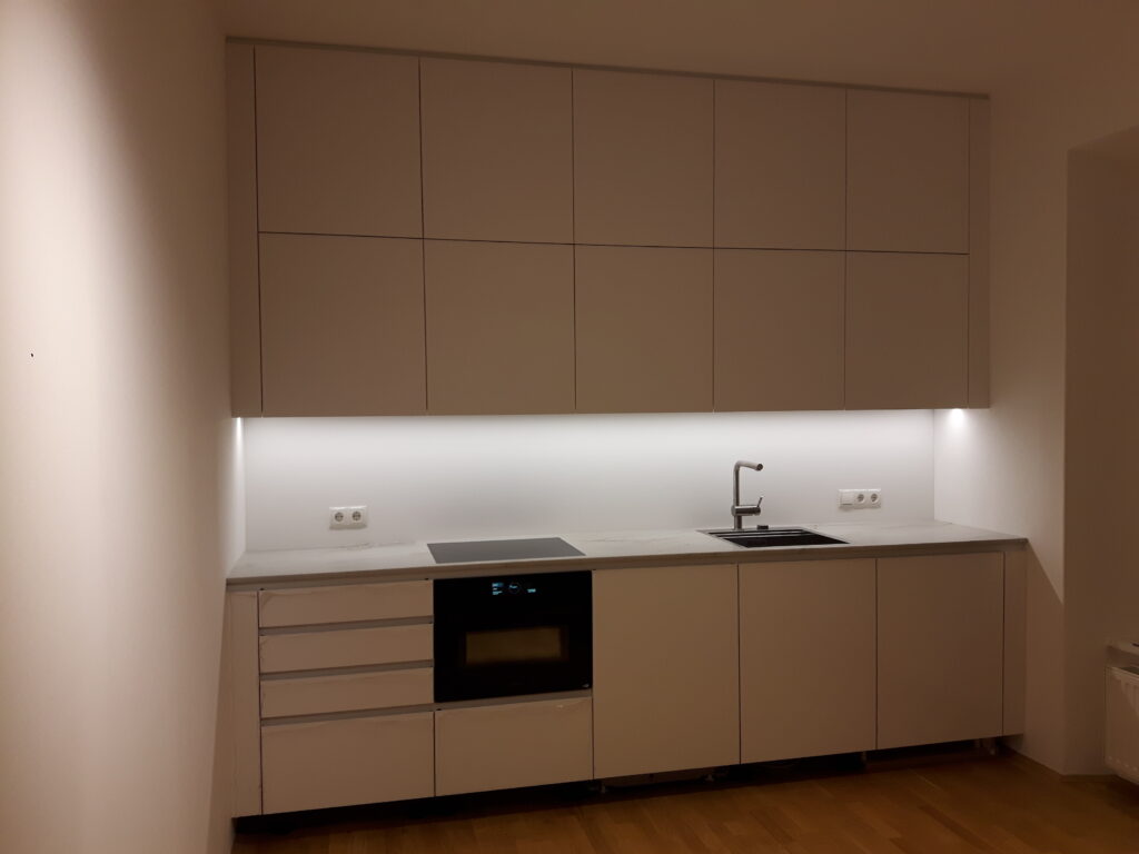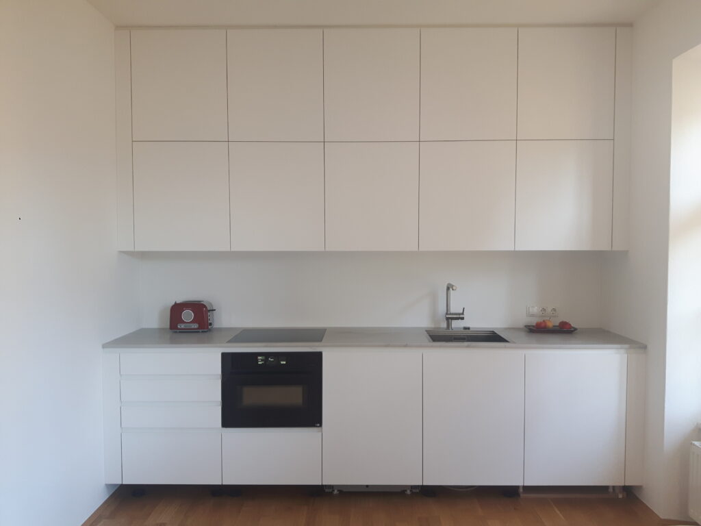 Die Küchenzeile ist an der Stirnseite des Wohnraums angeordnet und sollte gestalterisch den Hintergrund des Raumes bilden. Der optische Charakter entspricht mehr einem Möbelstück, während die funktionalen Elemente optisch zurückhaltend ausformuliert wurden.
