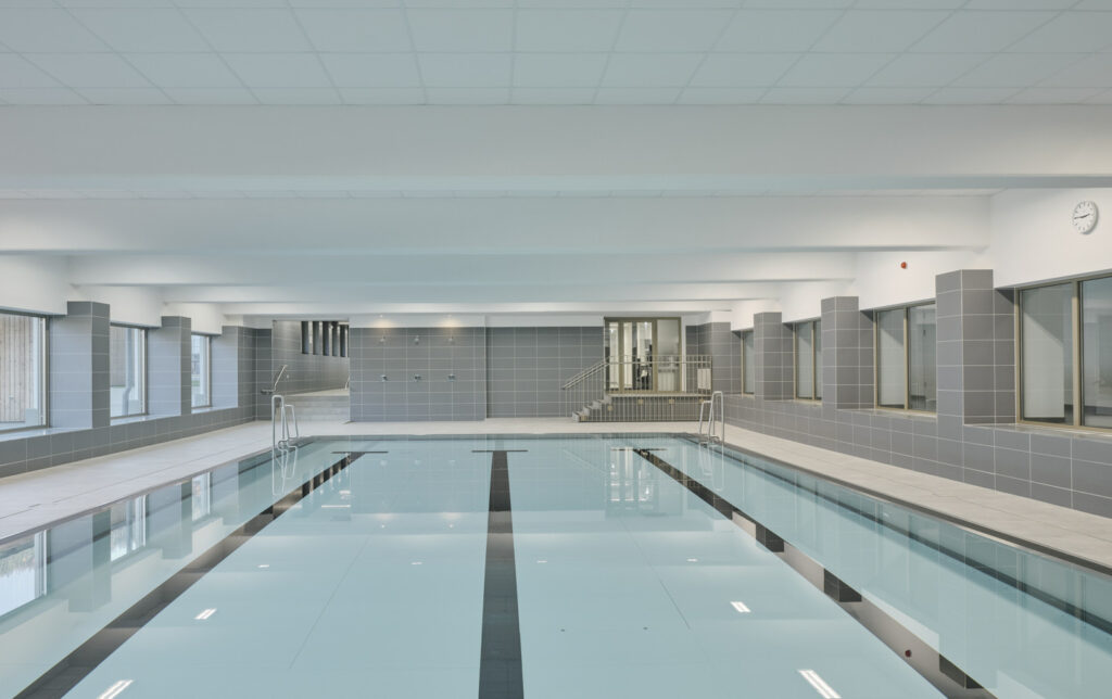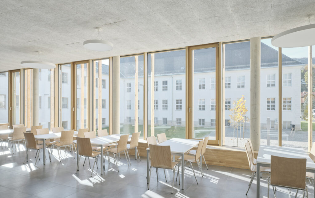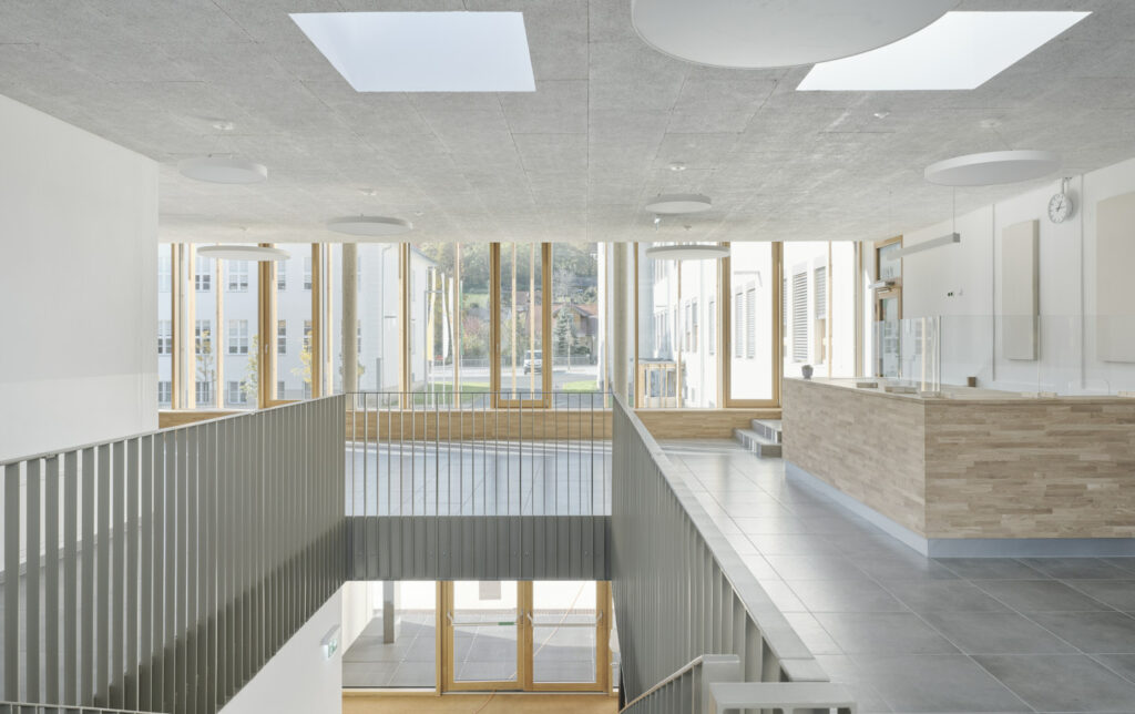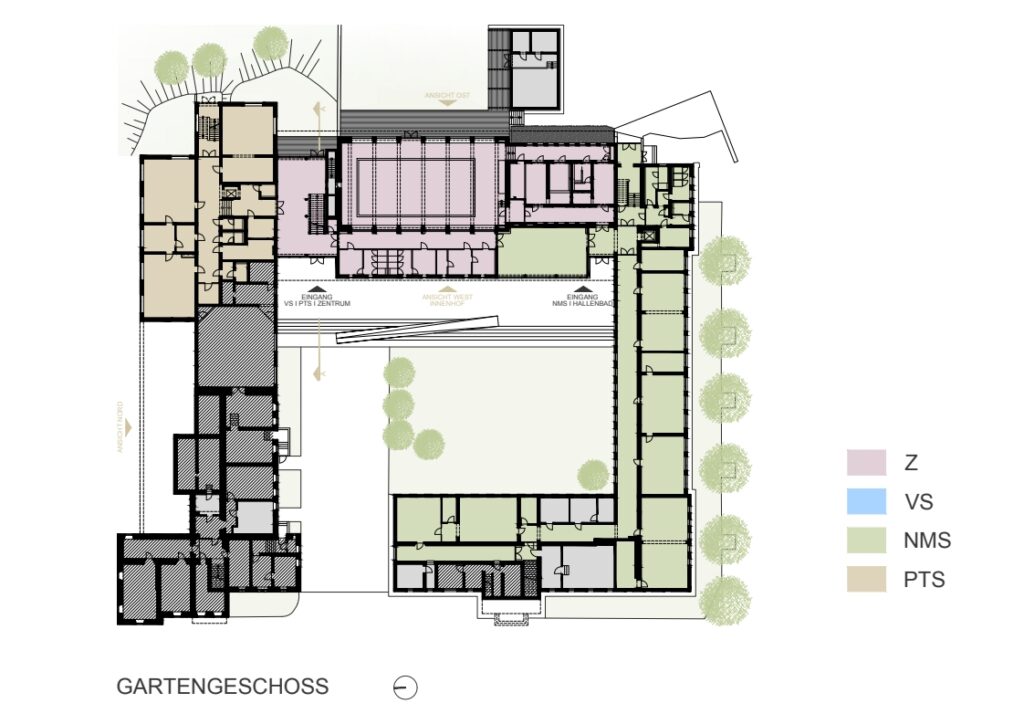 Die Grundidee des Entwurfes war es, bei prinzipieller Erhaltung des gesamten Ensembles, ein neues Zentrum zu schaffen, das die einzelnen Schulen verbindet und einen zusätzlichen Mehrwert in Form einer öffentlich nutzbaren Veranstaltungsfläche generiert. Dieses Zentrum wurde dem bestehenden Turnsaal vorgelagert und umschließt diesen im Norden, Westen und Süden. Es liegt somit tatsächlich in der Mitte und verbindet alle Gebäudeteile und Schulen auf der Ebene des Hauptgeschoßes miteinander. Es nimmt auch wichtige Funktionen der Nachmittagsbetreuung auf. Der Zugang zu allen drei Schulen, wie auch dem Mehrzwecksaal und dem Hallenbad, erfolgt nun über dieses gemeinsame Zentrum. Der Turnsaal selbst wurde zu einem Mehrzwecksaal ausgebaut, der nun auch für öffentliche Veranstaltungen genutzt werden kann. Große neugeschaffene Verglasungen schaffen eine enge funktionale und räumliche Verbindung zwischen Hof, Foyer, Turnsaal und Landschaft. In den einzelnen Schulen wurde den neuen pädagogischen Konzepten im Schulbau Rechnung getragen und ein Wandel von der Gang‐ zur Clusterschule vollzogen.
