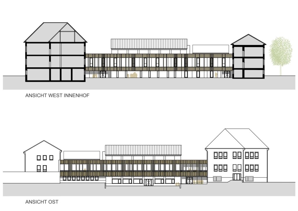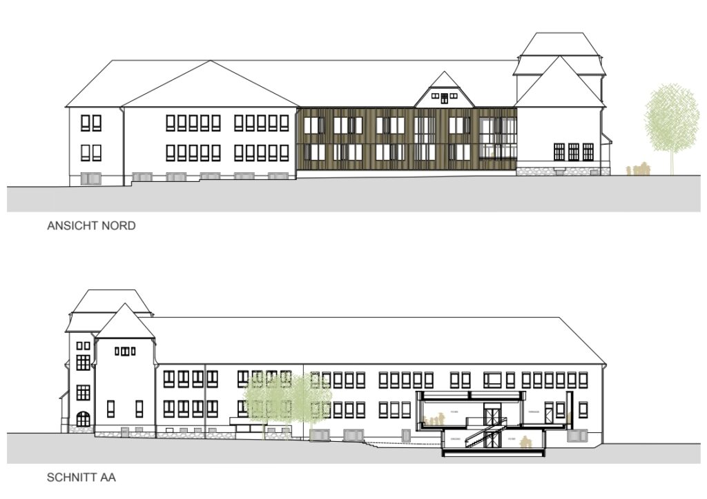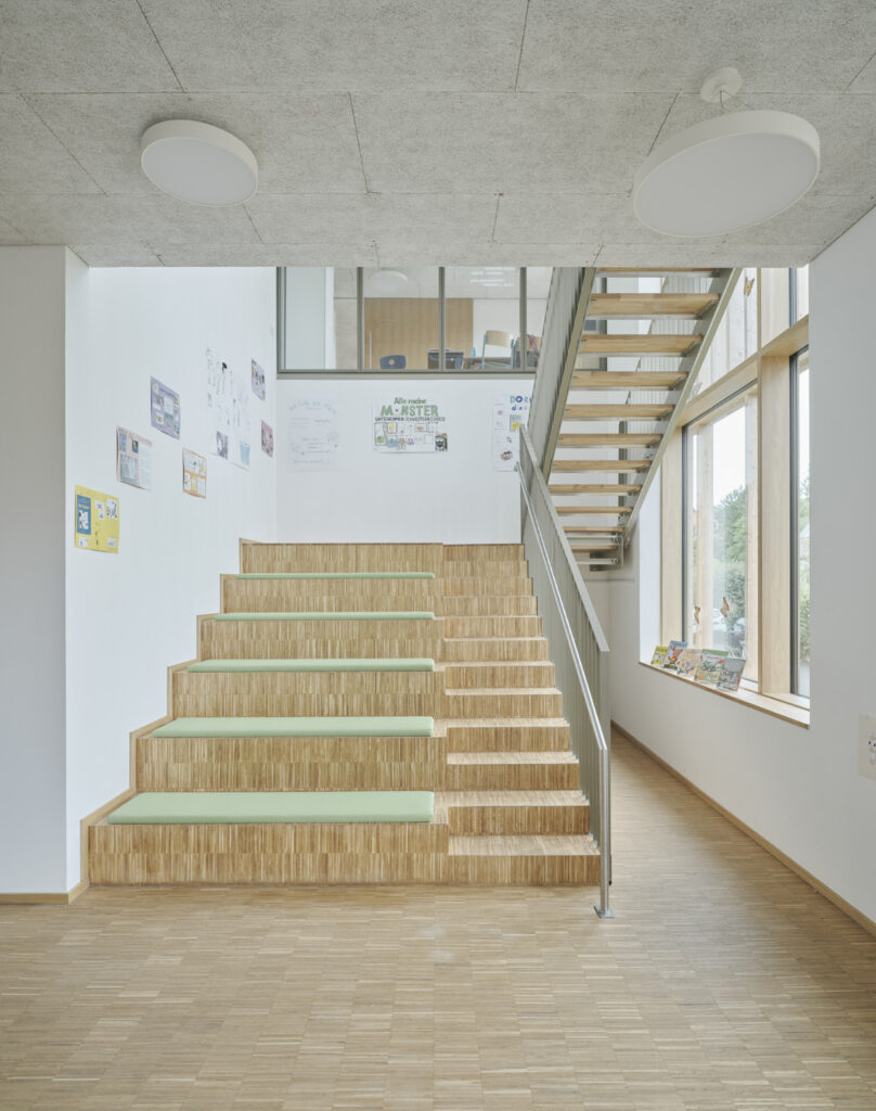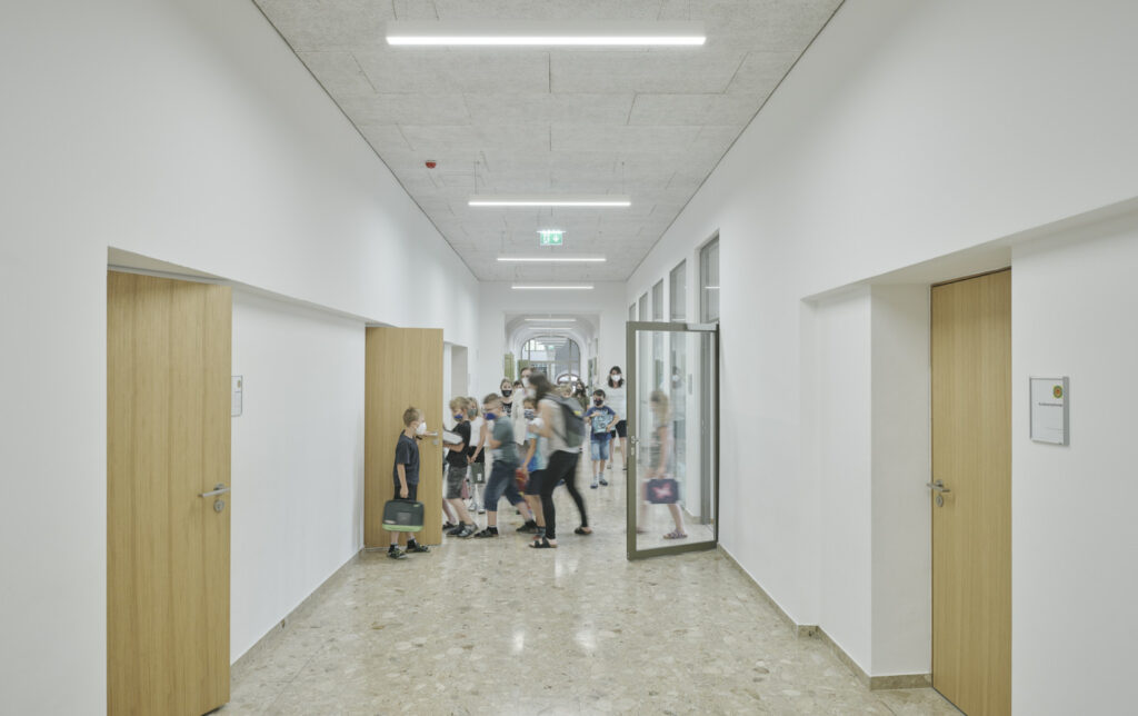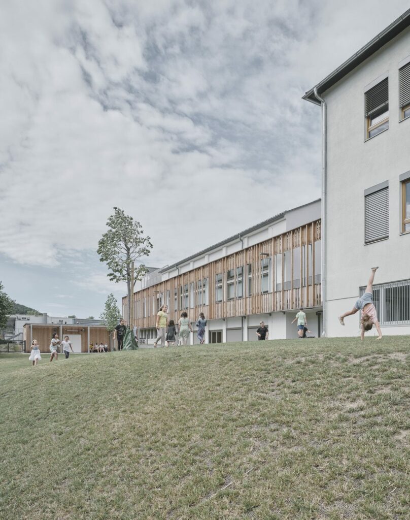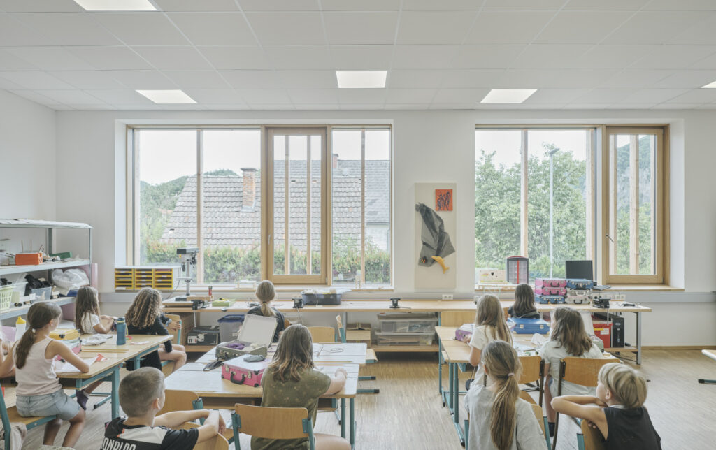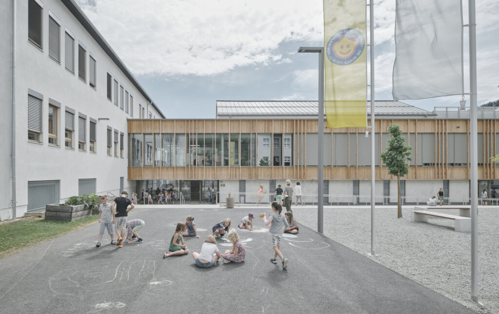 Das denkmalgeschützte Bestandsgebäude der „Alten Schule“ blieb in seinem äußeren Erscheinungsbild erhalten und wurde dem Denkmalschutz entsprechend unter Mitwirkung eines Restaurators behutsam saniert. Um die Volksschule als Clusterschule auszubilden, wurde im Norden ein Zubau vorgeschaltet, der „Marktplätze“, Gruppenräume und die Bibliothek aufnimmt. Die Schule ist in zwei 4er-Clustern mit „Marktplatz“ im EG und im 1. OG organisiert. Die beiden Cluster sind nun zusätzlich über die zweigeschossige Bibliothek miteinander verbunden.