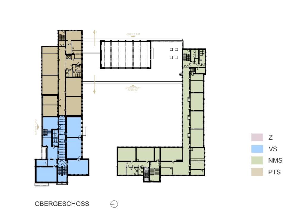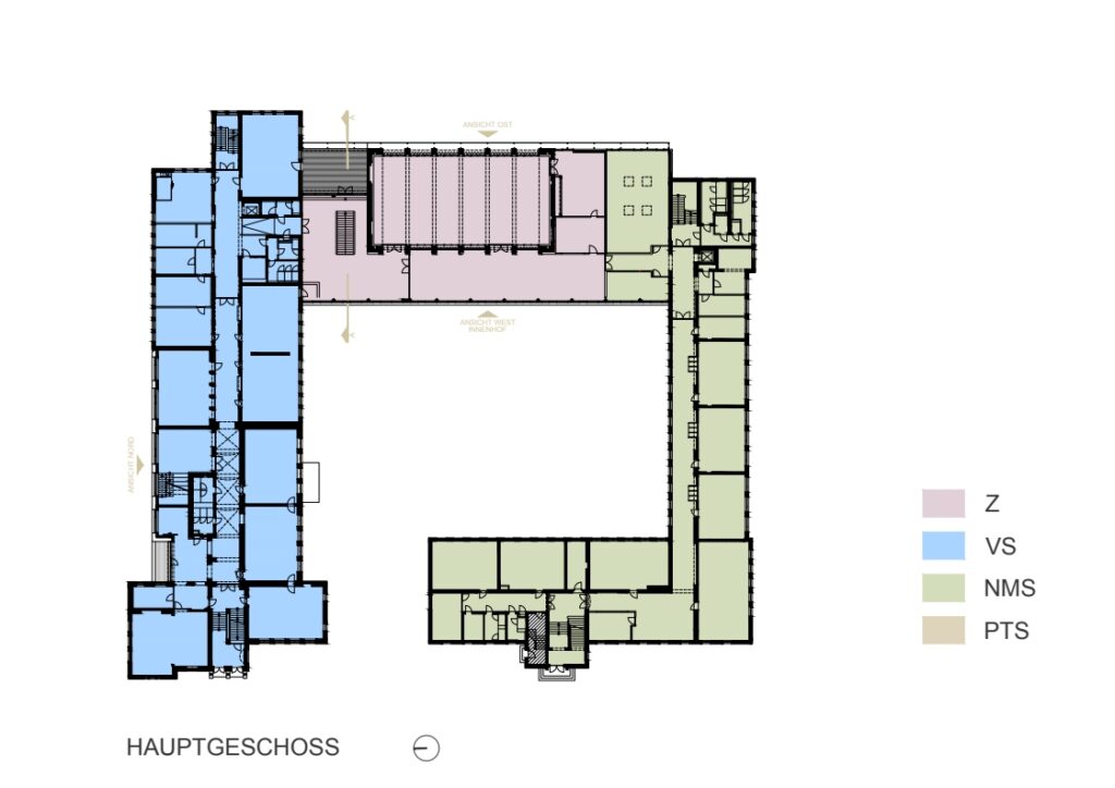 Die PTS ist eine eigene Funktionseinheit im 1.OG des Nordtraktes und ist über das neu geschaffene Stiegenhaus mit den anderen Funktionseinheiten verbunden. Die PTS-Werkstätten sind im UG. untergebracht und werden auch von den anderen Schulen mitbenutzt.