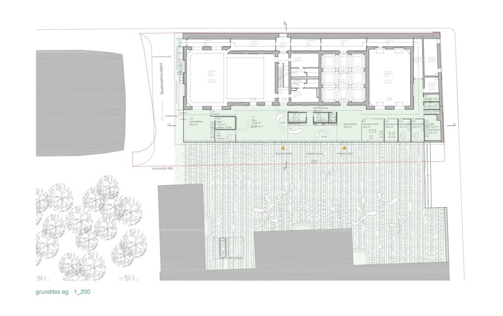 Für die Architekten war es nicht nur wichtig, mit dem neu zu errichtenden Foyer den heterogenen Gebäudebestand des Theater im Palais – TIP zu homogenisieren, sondern auch einen öffentlichen Platz – einen Campus – zu schaffen, der einerseits der Bedeutung der KUG, andererseits dem städtischen Umfeld gerecht wird.