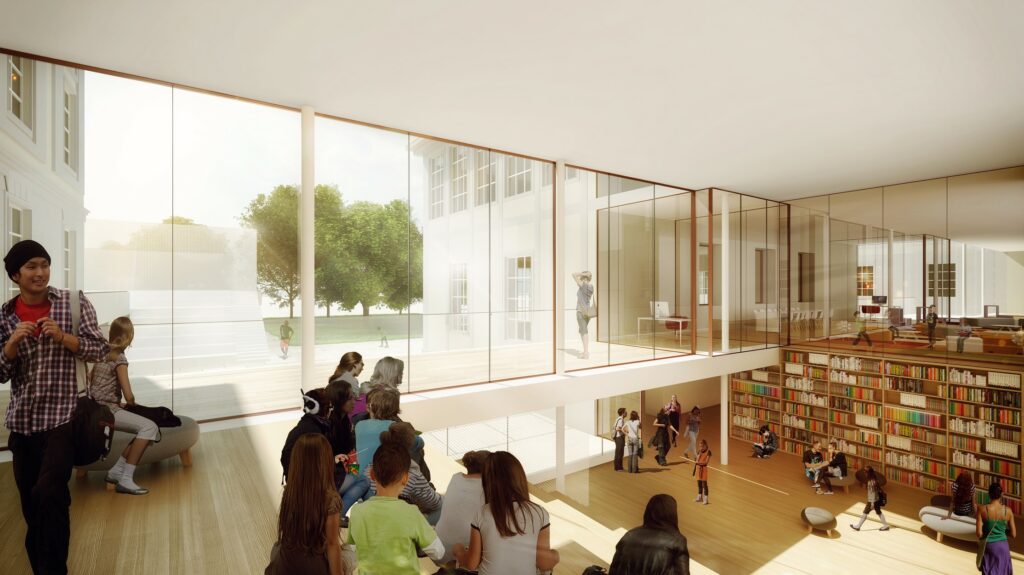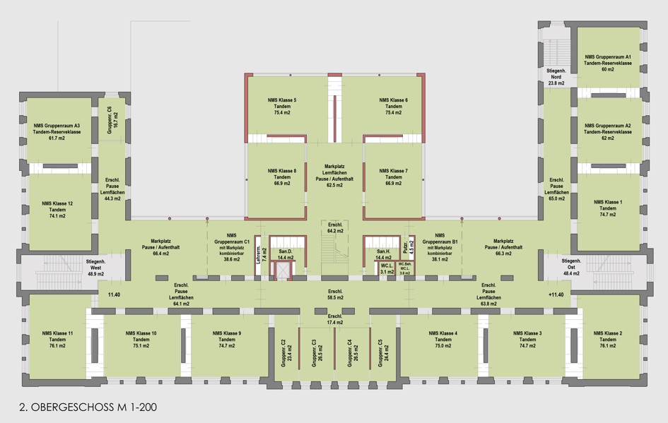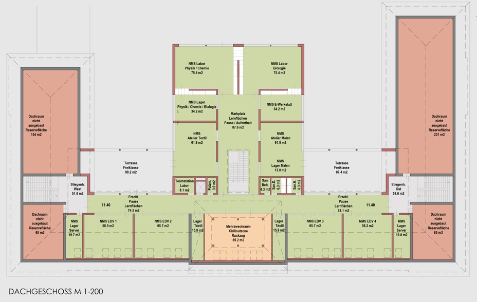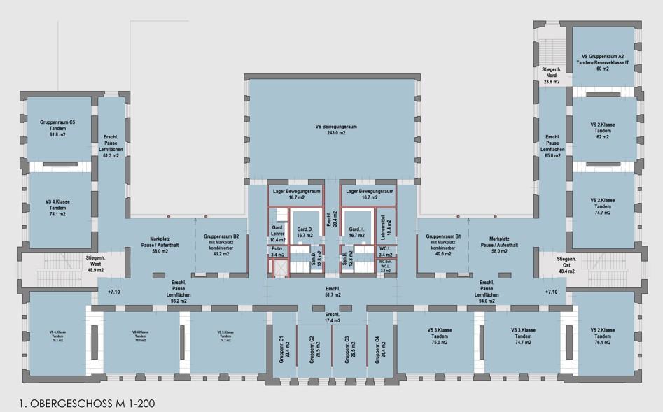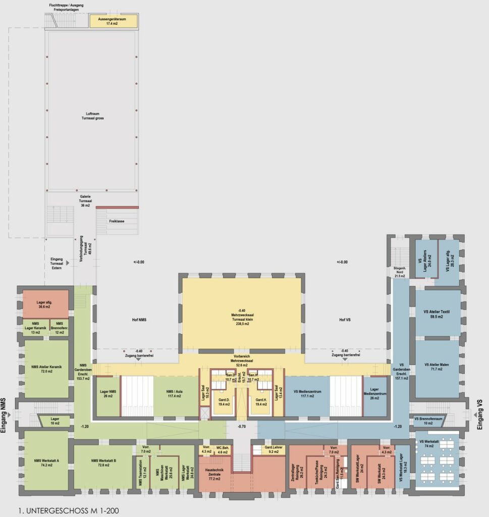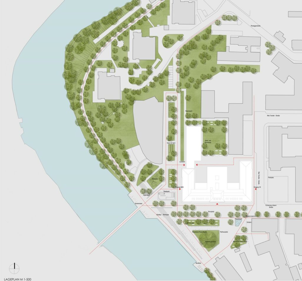 Durch den Abbruch des Zubaus aus den 70er Jahren entsteht in Verbindung mit dem bestehenden Rathausplatz ein neuer verkehrsberuhigter „Stadtschulplatz“. Eine neuen Sport-, Spiel- Freizeitachse Richtung Norden für schulische und öffentliche Nutzungen verbindet die die bis dato lediglich über eine Sackstraße erschlossene nördliche Murhalbinsel fußläufig besser mit dem Stadtzentrum. Durch den Abbruch des Zubaus wird der gesamte Freiraum entlang der Mur erheblich aufgewertet und dem Ankommen über die Fußgängerbrücke städtebaulich angemessen entsprochen. Durch den Neubau des Turnsaals entlang der Sportachse, entsteht ein klar definierter Schulhof, der mit der HTL einen Schulcampus bildet. Die Kinderbetreuungseinrichtung Josefinum wird aus der derzeitigen Hinterhofsituation befreit und rückt somit näher ins Zentrum des Geschehens. Alle kleinteiligen Schulanbauten im Hofbereich werden abgebrochen, während der bestehende Turnsaal im Hof erhalten bleibt und durch einen zentralen Neubau (zwischen Turnsaal und Klassentrakt) funktional besser in das Gesamtgefüge der Schule eingebunden wird. Dieser Neubau leistet die zentralen Funktionen von Bibliothek, Markplätzen (Clusterbildung gegeben) und gemeinschaftlicher Infrastruktur. Die beiden bestehende Höfe zwischen Turnsaal und Schulgebäude werden bereinigt und funktional aufgewertet. Das bestehende gründerzeitliche Schulgebäude bleibt an seiner Ost-, Süd- und Westfassade architektonisch unverändert, die Fassaden werden lediglich saniert. Durch den Abbruch des 70er Zubaus erhält das historische Schulgebäude seinen ursprünglichen Charakter als Solitär am Platz zurück. Die durch den Abbruch des Zubaus entstehenden Fehlflächen werden durch die Aufstockung des Turnsaals und den Teilausbau (ca. 50%) des Dachgeschosses ersetzt. Die turmartige Aufstockung des Turnsaals folgt architektonisch der zentralen Überhöhung des Haupttraktes. Die über der Traufe liegenden neuen Gebäudeteile werden mit einem kupferfärbigen Lochblech verkleidet und fügen sich so in die umgebende Dachlandschaft ein: die semitransparenten Blechpaneele können im Bereich der Fenster aufgeklappt werden.