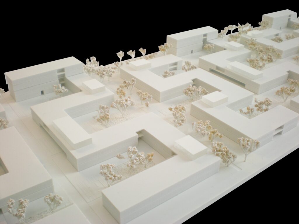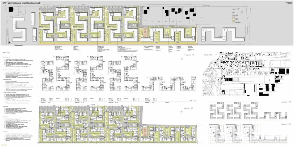 Die Wohnsiedlung versucht bewusst dem Verlust an Grünraum durch die rege Bautätigkeit im Bezirk St. Peter der letzten Jahrzehnte entgegenzutreten. 2015 bis 2021 entstanden, in vier Bauabschnitte unterteilt, circa 400 Wohneinheiten samt einem Kindergarten. Der Wohnbau ist im suburbanen Raum zwischen dem Einkaufszentrum Murpark im Westen und dem östlich gelegenen Industriepark Messendorf verortet. Kleinteilige Einfamilienhausstrukturen und die Zufahrtsstraße im Norden, sowie Ackerflächen und Gewächshäuser im Süden begrenzen das ungefähr 100 Meter breite und 500 Meter lange Grundstück. Das Entwurfskonzept ist auf den ersten Blick erkennbar: Mäanderförmige, in die Länge gezogene Volumina lockern die Siedlung in Nord-Süd Richtung auf und formen unterschiedlich große, innen liegende Hofsituationen, die auch die Zentren der Siedlung bilden. Ein diffiziles Wegesystem bestehend aus sich abwechselnden, breiten Wohnstraßen und Grünzonen von Norden nach Süden hin sowie mehrere von Osten nach Westen verlaufende Fußgängerwege verbinden die Innenhöfe. Sie bieten wechselnde Blickbeziehungen und bilden sanfte, kommunikationsfördernde Übergänge zwischen den einzelnen Baukörpern und den unterschiedlich großen öffentlichen, halböffentlichen und privaten Flächen. Auf angenehme Art und Weise verliert man sich beim Durchschreiten der labyrinthartig anmutenden Siedlung. Hohe Wichtigkeit wird dem Bezug zum Außenraum und dem Wohnen in der Nachbarschaft zugesprochen. Dieser Gedanke wird konsequent im Umgang mit Fahrzeugen fortgeführt, die nur in bestimmten Fällen Zufahrt zur Siedlung haben und ansonsten in Tiefgaragen untergebracht sind. Angenehm auflockernd wirken auch die wechselnden Höhen der Baukörper. Der verdichtete Flachbau variiert zwischen zwei und vier Geschossen wodurch das Bild einer gewachsenen Siedlung im suburbanen Raum entsteht – es lassen sich klare Bezüge zum Prinzip der Gartenstadt oder zum skandinavischen Siedlungswesen erkennen. Die gesamte Siedlung ist in Holzbau errichtet. Der Wohnbau ist in einem sichtbar menschlichen Maßstab geplant, die Aneignung des Raums durch die Bewohner ist erwünscht, dennoch bietet die Bebauung genügend Intimität für Einzelne. Die reduzierte Architektur spiegelt sich auch in der schlichten Materialwahl wider: Beton, Putz, Holz, verzinkter Stahl und Glas bilden die fünf sichtbaren Hauptelemente. Die Gebäudefassaden werden vor allem durch die großzügigen Balkone, Laubengänge sowie Stiegenhäuser gegliedert, die einzelnen Öffnungen der Wohnungen selbst scheinen in den Hintergrund zu treten. Die Materialwechsel zwischen der hellgrauen, kühl wirkenden Putzfassade und der horizontalen, warmen Holzlattung bilden einen angenehmen Kontrast und vermitteln subtil den Wechsel zwischen öffentlichen und privaten Räumen. Weitere strukturgebende Fassadenelemente sind die kollonadenartig angeordneten Stahlbetonstützen der Laubengänge. Sie treten aus der Konstruktion hervor, werden bewusst nicht versteckt und gliedern die breiten, unterschiedlich langen Erschließungssituationen. Der Wohnbau am Sternäckerweg bietet durch die klare strukturelle Aussage seiner Baukörper und die Zonierung der Freiräume und Höfe mit einfachen formalen Mitteln eine hohe Lebensqualität.