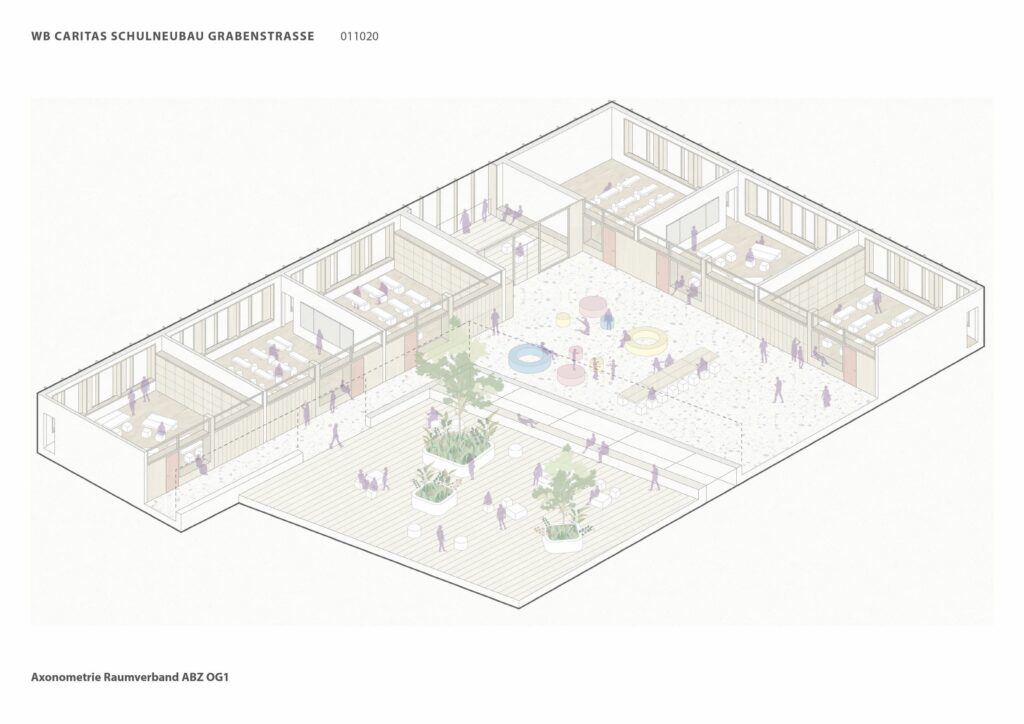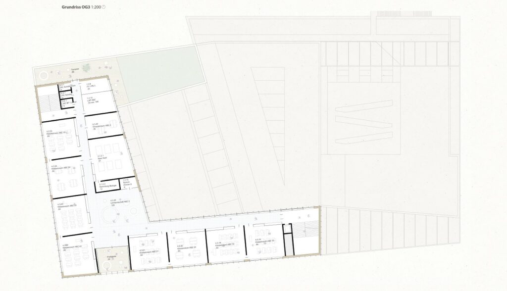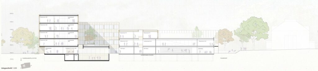 Das Bauvolumen des Neubaus orientiert sich im Norden und Süden an den vorgegebenen Baugrenzlinien, im Westen am Grenzabstand zum Kindergarten. Der U-förmige Neubau nimmt in seinen Hauptachsen die Erschließungsachsen des Bestandes auf und bildet im 1.OG über dem Turnsaal einen neuen Pausenhof. Die Höhenentwicklung der gesamten Schule staffelt sich von 2 Geschoßen im Osten (Bestand) bis hin zu 5 Geschoßen im Westen (Neubau) und vermittelt so städtebaulich zwischen der relativ niederen Bebauung im Norden und Osten und der deutlich höheren Bebauung Richtung Hasnerplatz. Die baulichen Eingriffe in die Bestandsschule sollen so gering als möglich ausfallen, lediglich im EG, im Bereich des Haupteinganges, wird in die Rohbaustruktur eingegriffen. Die eingeschossige Aufstockung der Bestandsschule wird aus statischen Gründen in Holzbau vorgeschlagen. Durch die terrassenartige Abstufung des Baukörpers (2 bis 5 Geschoße) können Teilbereich der Flachdächer als Terrassen genutzt werden. Die restlichen Dachflächen sind als intensive Gründächer konzipiert. Das großzügige neue Vordach über dem Haupteingang wird im 1.OG ebenfalls als wertvoller Freibereich aktiviert. Dieser Freibereich wird durch eine großzügige Pergolakonstruktion, die gleichzeitig als Rankhilfe für eine üppige Begrünung dient, beschattet. Um den Gesamtkomplex mit dessen heterogenen Gebäudeteilen zusammenzufassen, werden die bestehenden Fassadenelemente aus Stahlblech entfernt und durch vertikale Holzlamellen ersetzt.