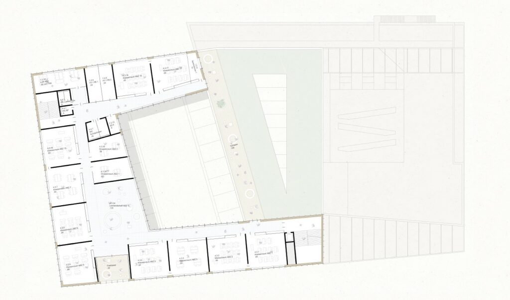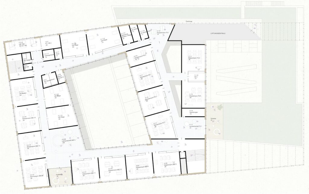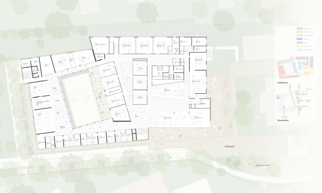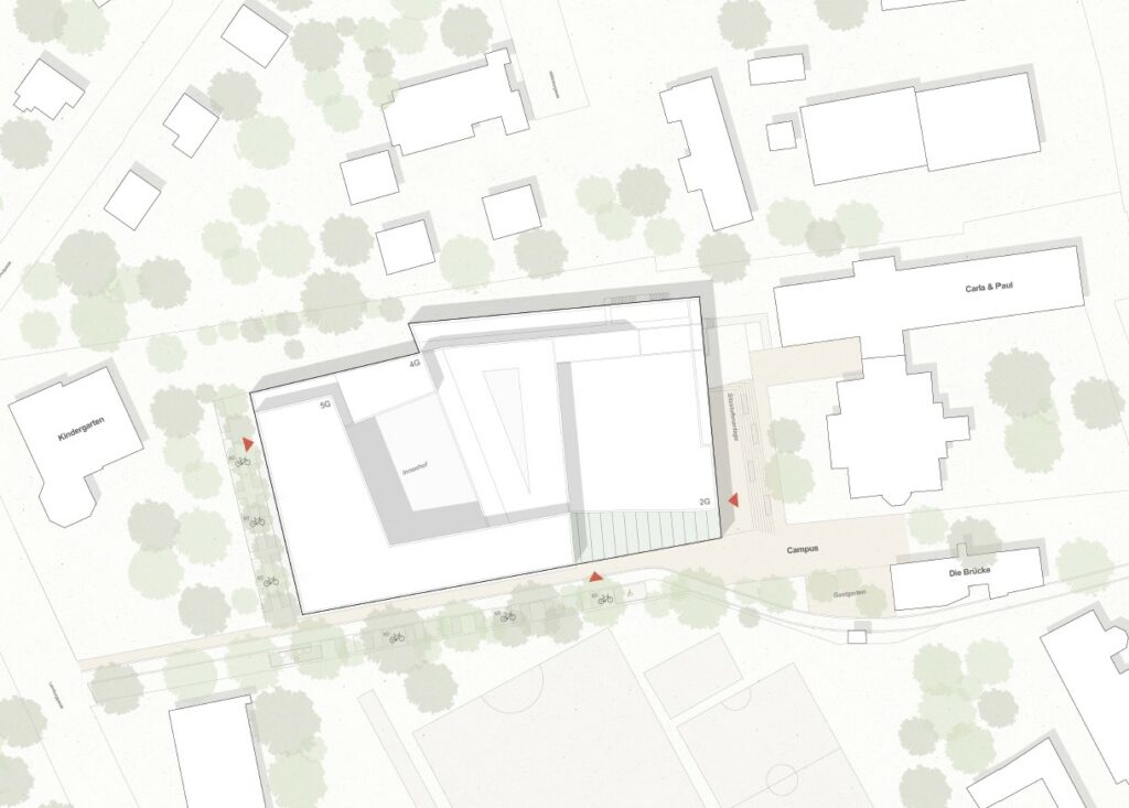 Um die Schule mit der Villa und dem Veranstaltungszentrum die „Brücke“ zu einem Campus zusammen zu fassen, ist die Schaffung einer großzügigen Platzsituation angedacht. Dazu wird das Gelände im Bereich der Süd-Ost-Ecke der Bestandsschule um ca. 1,5 Meter abgesenkt und mit einer Sitzstufenanlage ausgestattet. Es entsteht ein großzügiger, teilweise überdachter Freibereich, der als Pausenhof und Zentrum für den gesamten Campus genutzt werden kann.